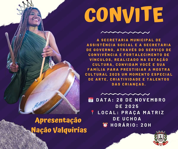 Na próxima sexta-feira (28/11), a Secretaria de Governo e a Secretaria Municipal de Assistência Social promovem a Mostra Cultural 2025, com apresentação das crianças atendidas pelo Serviço de Convivência e Fortalecimento de Vínculos.