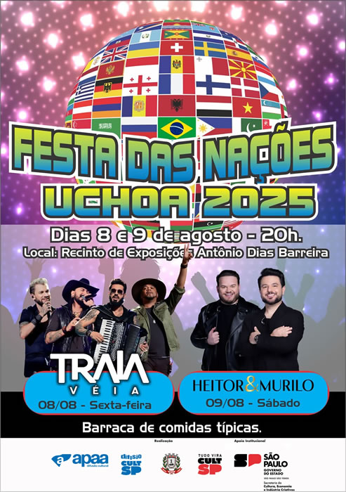 Está chegando a Festa das Nações de Uchoa 2025! A festa beneficente será promovida pela Prefeitura Municipal de Uchoa em prol das entidades do município.