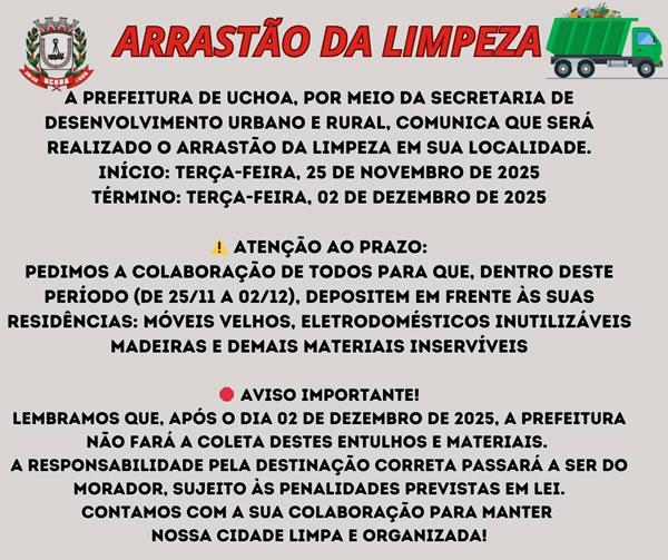 A Prefeitura de Uchoa comunica que será realizado o arrastão da limpeza de 25 de novembro a 02 de dezembro. Após esse período, a prefeitura não fará a coleta desses materiais, sendo de responsabilidade do morador.