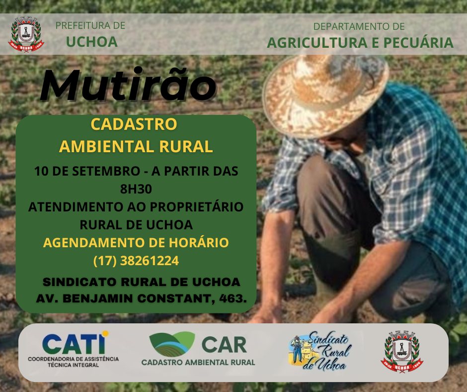 O Departamento de Agricultura e Pecuária informa que será realizado o Mutirão do cadastro ambiental do seu imóvel rural (CAR), dia 10/09, no Sindicato Rural de Uchoa, a partir das 8h30.