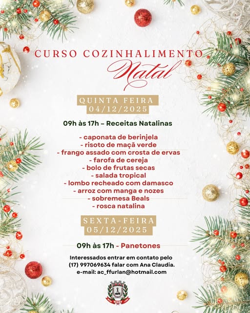 Nos dias 04/12 e 05/12 a Prefeitura de Uchoa promove a qualificação de cursos de culinária natalina. Acompanhe o dia, horário e os cursos: