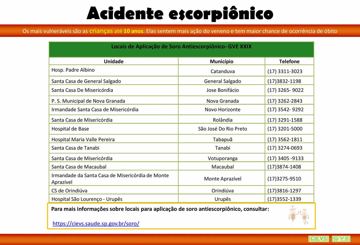 No Estado de São Paulo existem em três espécies de escorpiões de importância médica: o Tityus serrulatus, ou escorpião amarelo, o mais prevalente, que causa o maior número de acidentes e os de maior gravidade.